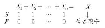 $X_i ~ B(p)$라고 할 때, 확률변수 $X$는 $n$개의 베르누이시행에서 성공한 횟수를 의미합니다.