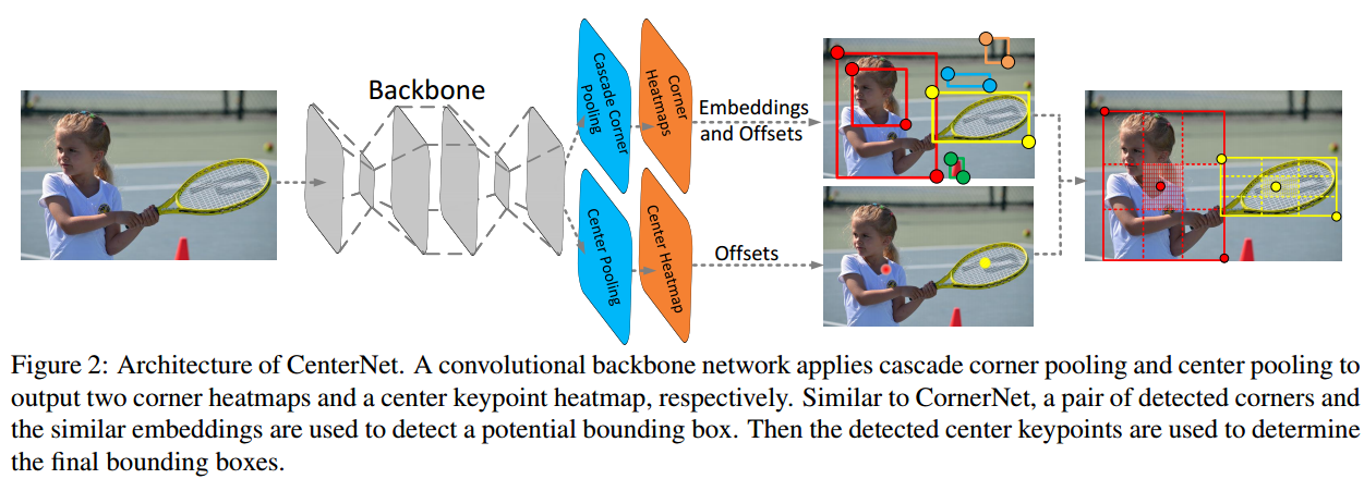 CenterNet의 전체 구조입니다. Backbone이 생성한 feture map에 Cascade Corner pooling으로 좌측 상단, 우측 하단의 특징점을 찾아내고, Center pooling은 중심점을 찾습니다.