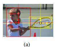 Cascade corner pooling은 좌측 상단, 우측 하단 특징점을 찾는 방법이며, CornerNet에서 사용하는 corner pooling을 개선했습니다. 기존에는 객체의 경계에 존재하는 pixel의 max 값만을 활용했다면, Cascade corner pooling은 객체 경계 안쪽 정보까지 활용합니다.