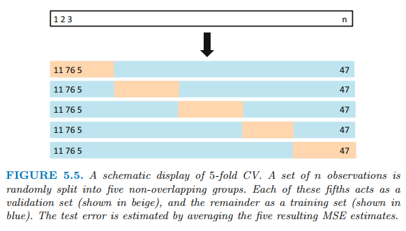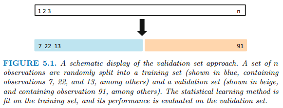 Resampling Methods는 training data의 서로 다른 부분 집합을 사용하여 동일한 통계 모델을 여러번 fitting 하는 것을 의미합니다. 모델 평가(model assessment), 모델 선택(model selection)을 위해 사용합니다.