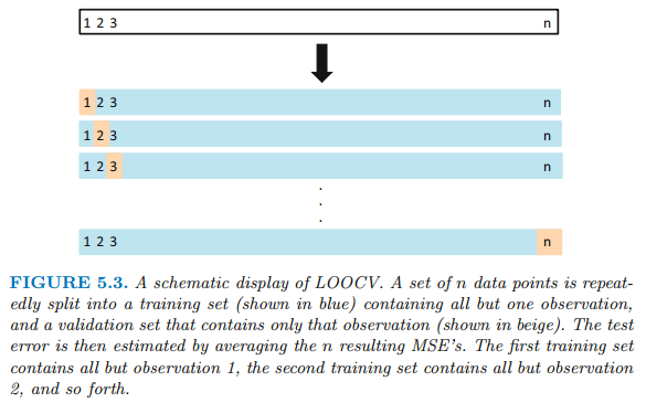 - 단 하나의 관측값(x1, y1)만을 validation set으로 사용하고, 나머지 n-1개 관측값은 train set으로 사용합니다.