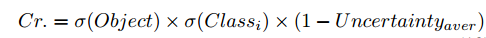 최종 바운딩 박스의 socre을 다음과 같이 계산합니다. 기존의 YOLOv3에서 불확실성이 추가되었습니다.