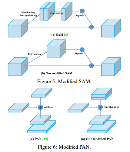 YOLOv4는 SAM과 PAN을 수정해서 사용합니다. 왜 이런 수정을 했는지에 대해서는 언급하고 있지 않습니다.