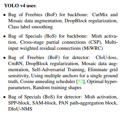 Bag of Specials는 inference cost를 증가시키는 모델 내부에 사용하는 모듈 또는 후처리 방법을 의미합니다. 예를 들어, NMS, M2Det에서 제안하는 SPMs, residual unit, 활성화 함수 등을 의미합니다.