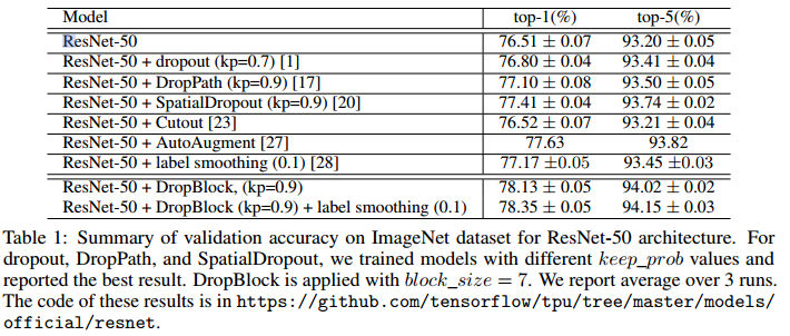 이 논문에서는 CNN에 정규화를 적용하기 위한 dropout의 구조화된 형태인 DropBlock을 제안합니다. DropBlock을 skip connection과 convolutional layer에 적용하여 정확도를 높이고, 하이퍼파라미터의 영향에 more robust 하게 됩니다.