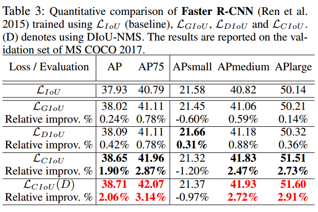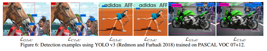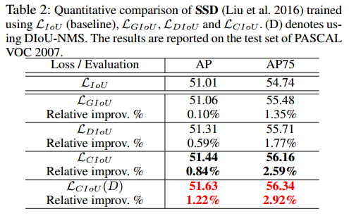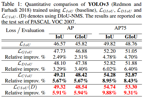 YOLOv3을 VOC dataset에 IoU, GIoU, DIoU, CIoU loss로 학습한 것을 비교한 결과합니다. (D)는 DIoU NMS를 의미합니다.