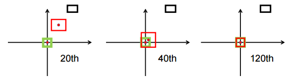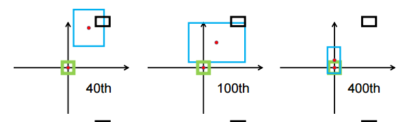 위 그림은 iteration에 따른 GIoU Loss의 바운딩 박스 예측 과정입니다. 검은 박스는 anchor, 초록 박스는 target, 파랑색 박스는 predicted를 의미합니다. 매 반복이 진행하면서 target과의 overlap을 위해 predicted box의 영역이 넓어 집니다. 그리고, target과 overlap이 된 이후로부터 IoU를 높이기 위해 predicted box의 크기를 줄여 나갑니다.