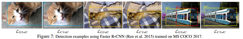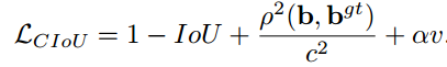 즉, GIoU Loss의 문제점은 수렴 속도가 너무 늦고 수평 또는 수직 방향에 대해서 Loss가 너무 높다는 것입니다. 이 문제를 개선하기 위해 CIoU Loss는 IoU, 중심점, aspect ration 세 가지 요소를 고려합니다.