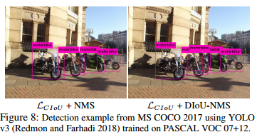아래 그림은 기존 NMS와 DIoU-NMS의 비교입니다.