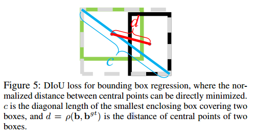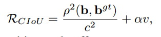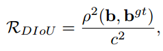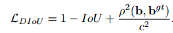 로우는 Euclidean distance를 의미하고, b와 b^gt는 predicted box, target box의 중심점 좌표를 의미합니다. c는 predicted box와 target box를 덮는 박스의 대각 길이를 의미합니다. 중심점을 고려하는 panalty term을 추가한 것입니다.