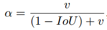 v는 두 박스의 aspect ration의 일치성을 측정합니다. a는 non-overlapping case와 overlapping case의 군형을 조절합니다. 특히 non-overlapping 경우에 우선순위를 부여하는 역할을 합니다.