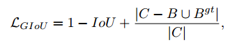 GIoU Loss는 IoU Loss가 non overlapping 된 경우를 고려하지 않는 문제점을 개선하기 위해 panalty term을 추가한 것입니다. C는 target과 predicted를 다 덮는 박스의 넓이를 의미합니다. panalty term을 추가함으로써 non-overlapping 된 box도 gradient 정보를 제공합니다.