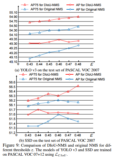 IoU를 threshold로 사용하는 nms는 동일한 class를 지닌 ground truth box가 겹쳐져 있다면 해당 박스를 supression 하는 문제점이 존재합니다. 예를 들어, 얼룩말들이 뭉쳐져 있다면, 하나의 얼룩말만 남겨두고 나머지 얼룩말은 supression 됩니다. DIoU를 threshold로 사용한다면 바운딩 박스의 중심점이 다른 경우도 고려하므로 ground-truth가 겹쳐져 있는 경우에 대해서 robust 하다는 장점이 있습니다.