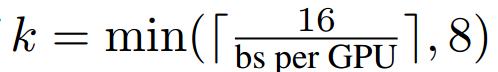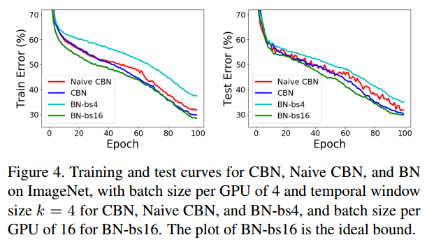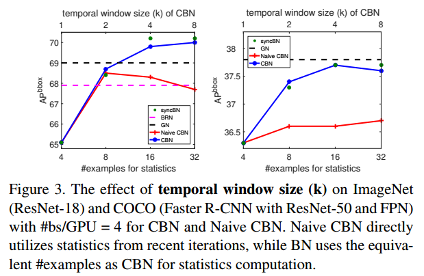 학습 초반에는 가중치가 급격하게 변하므로 k=1을 사용하라고 권합니다. CBN에서 k=1이 되면 일반적인 BN 연산을 수행합니다. k=1을 사용하는 기간을 burn-in period라고 표현하며 ImageNet classfication 에서는 25 epochs, COCO object detection에서는 3 epoch동안 burn-in period를 사용하라고 권합니다.