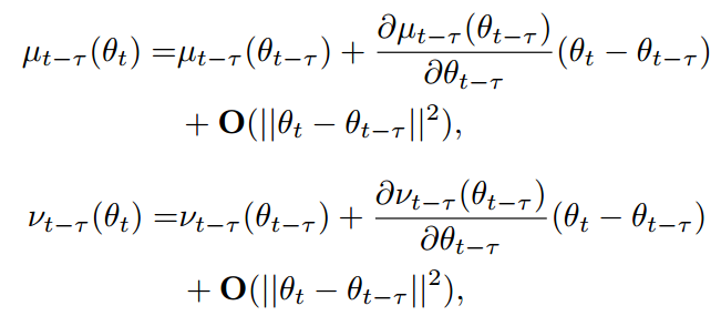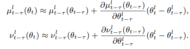 t-$\tau$ 번째 가중치로 계산한 평균과 분산을 테일러 시리즈로 compensation하여 현재 가중치로 계산한 평균과 분산으로 근사화 하는 것입니다. v는 E(x^2)를 의미합니다. v와 u를 안다면 v-u^2로 분산을 계산할 수 있습니다.