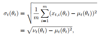 v는 E(x^2)를 의미합니다. 이 논문에서 v 계산식에 max 연산을 사용합니다. 분산을 계산할 때 E(x^2)가 E(x)^2보다 커야 E(x^2) - E(x)^2을 만족합니다. v와 u는 테일러 시리즈로 근사화된 값이므로 E(x^2) > E(x)^2 조건을 위반할 수 있습니다. 따라서 max 연산을 사용합니다.