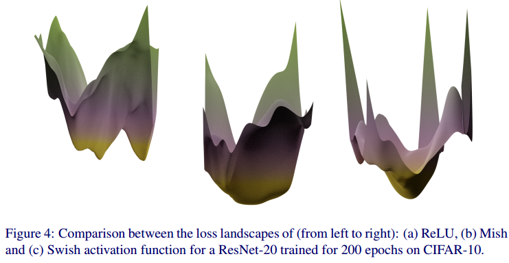 Loss 값을 시각화한 그림입니다. (b) Mish의 Loss값이 부드럽게 형성되어 있어 더 쉬운 최적화와 더 나은 일반화를 돕습니다. 또한 넓은 minima 구역을 갖고 있으며, 가장 낮은 loss값을 갖습니다.