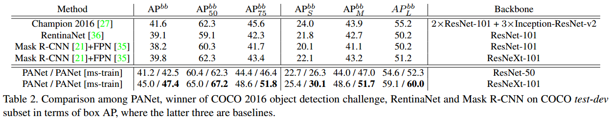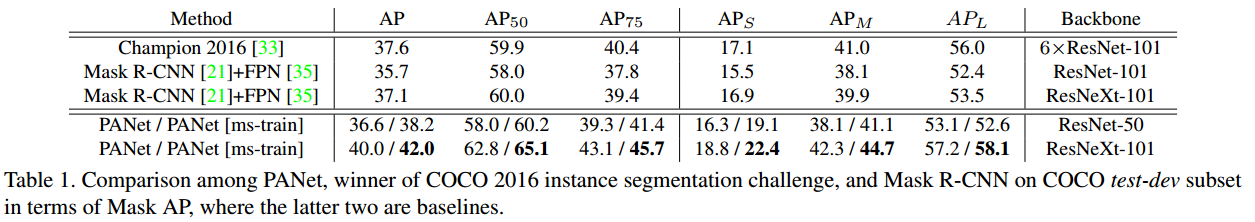 PANet은 Mask R-CNN을 기반으로 Instance Segmentation을 위한 모델입니다. 이 논문에서 제안하는 Bottom-up path augmentation과 Adaptive feature pooling 방법은 YOLOv4에서 사용할 만큼 효과적인 성능을 나타내고 있습니다.