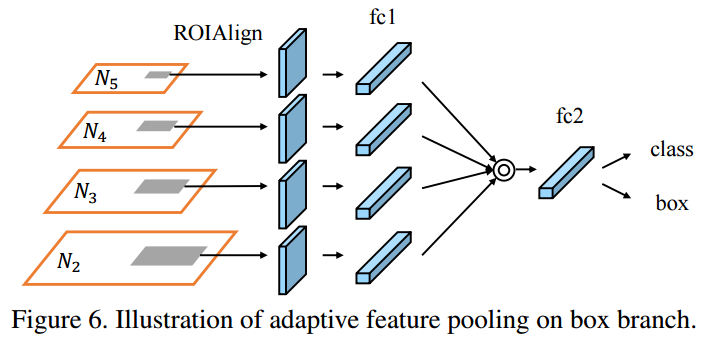 N2~N5 각각의 feature map에 RPN이 적용되여 RoI를 생성합니다. 각 피쳐맵에서 생성된 RoI는 RoI Align을 거쳐서 일정한 크기의 벡터가 생성됩니다. Adaptive Feature Pooling은 각 피쳐맵에서 생성한 일정한 크기의 벡터를 max 연산으로 하나로 결합합니다. 하나로 결합된 벡터에서 class와 box를 예측하는 것입니다.