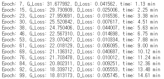 print('Epoch: %.0f, G_Loss: %.6f, D_Loss: %.6f, time: %.2f min' %(epoch, g_loss.item(), d_loss.item(), (time.time()-start_time)/60))