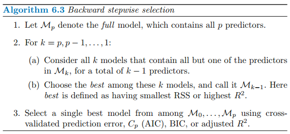 - 전진 단계적 선택과는 다르게 모든 설명 변수를 포함한 full least squear model에서 시작하여 반복적으로 하나씩 설명변수를 제거해 나갑니다.