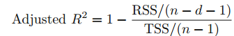 adjusted R2는 서로 다른 변수를 포하하는 모델 집합을 선택하는 유명한 방법입니다. R2는 1-Rss/TSS로 정의되었습니다. RSS는 모델에 변수가 추가될 때마다 감소하기 때문에, 변수가 추가되면 R2는 항상 증가했습니다. d개의 변수를 지닌 최소제곱 모델에서 adjusted R2는 다음과 같이 계산합니다.