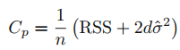 d개의 변수를 갖고 있는 적합된 최소 제곱 모델에 대하여 test MSE의 Cp는 다음 식을 사용하여 계산합니다.