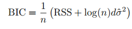 BIC는 베이지안 관점으로 유도됩니다. 그리고 Cp 또는 AIC와 비슷합니다. d개의 변수를 지닌 최소제곱 모델에 대하여 BIC는 다음과 같이 계산합니다.
