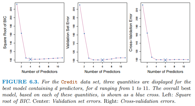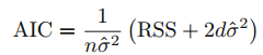 위 식에서 시그마는 각 response에 대한 error의 분산을 의미하고, d는 predictor의 수를 의미합니다. training error는 test error를 과소평과 하기 때문에 2d$\sigma^2$만큼 패너티를 가합니다. d가 많아질수록 train RSS가 작아지므로 페널티는 더 크게 가합니다. Cp가 낮은 값을 갖는 모델이 best 모델 집합입니다.