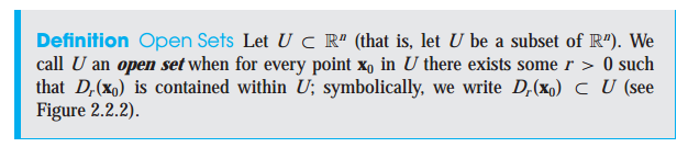 열린 집합은 열린 원판 Dr(x_0)이 U에 존재하고, U가 R^n의 부분집합인 경우에 이 U를 열린 집합이라고 합니다. 정의에 의해 공집합도 열린 집합이 됩니다. 또한 열린 원판도 열린 집합입니다.