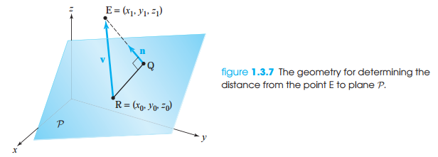 평면 위의 한 점 R = (x0, y0, z0)과 E = (x1, y1, z1) 사이를 잇는 벡터 v를 unit normal vector에 사영(projection)한 뒤에 계수 값만 가져오면 거리를 구할 수 있습니다.