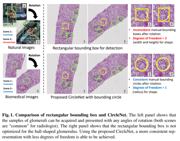 CircleNet은 신장에 존재하는 사구체를 검출하기 위한 모델이며, 기존의 사각형의 바운딩박스가 아닌 원 모양의 바운딩 박스를 사용합니다. 원 모양의 바운딩 박스를 사용함으로써 (1) 객체 검출의 degree of freedom을 감소시킬 수 있습니다. 예를 들어, 바운딩박스 높이와 너비 2로 표현되는 객체가 원 모양을 사용하면 반지름 1로 표현할 수 있습니다. (2) rotation에 invariant 합니다. 회전에 불변하므로 IoU가 더 높게 나오겠네요. (3) 구 형태의 객체에 최적화 되어있습니다.