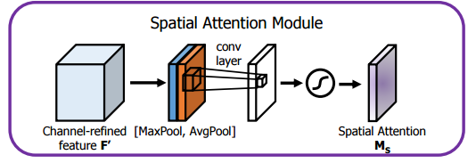 Spatial attention module은 어디에 중요한 정보가 있는지 집중하도록 합니다. channel attention map과 input feature map을 곱하여 생성한 F`에서 채널을 축으로 Maxpool과 Avgpool을 적용해 생성한 1xHxW의 F_avg와 F_max 두 값을 concatenate 합니다. 여기에 7x7 conv 연산을 적용하여 spatial attention map을 생성합니다.