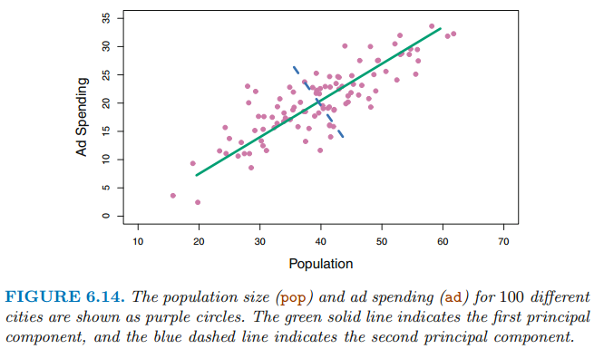 위 그림은 두 번째 주성분 요소와 pop, ad를 시각화 한 것입니다. 두 번째 주성분 요소와 두 변수 사이의 관계가 미약하다는 것을 알 수 있습니다. 이 예제에서는 2가지 변수만을 갖으므로 주성분 요소를 2개까지만 구할 수 있습니다. 또한 주성분들은 앞의 주성분들과 상관관계가 없다는 제한조건 하에서 분산을 최대로 합니다.