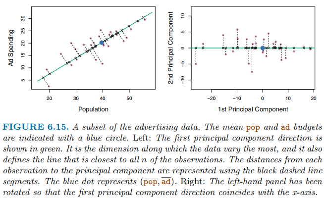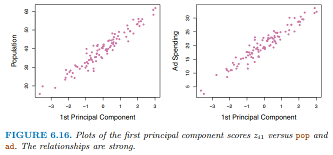위 그림은 첫 번째 주성분 점수 $z_{i1}$과 pop, ad 사이의 관계를 시각화 한 것입니다. 그림을 살펴보면 주성분 요소와 두 변수 사이에 강한 관계가 있음을 나타냅니다. 다른말로하면 첫 번째 주성분 요소는 pop과 ad가 포함하고 있는 대부분의 정보를 포착한다고 생각할 수 있습니다.