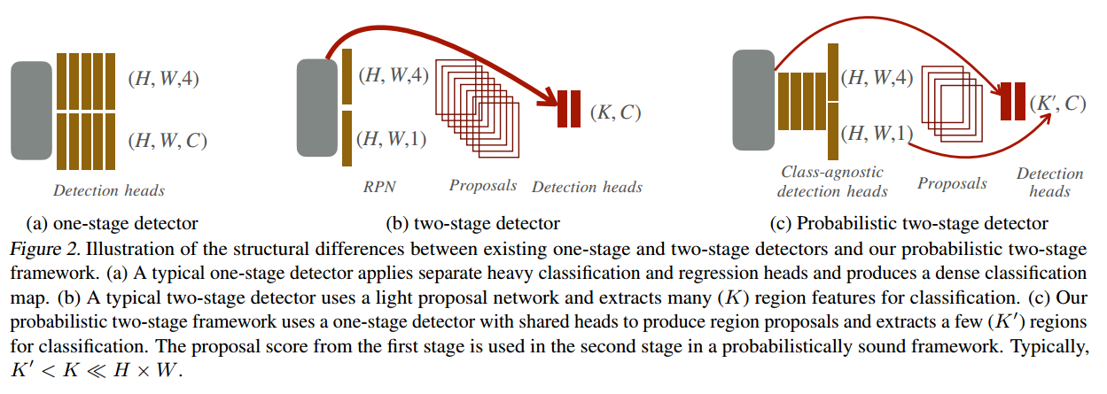 two-stage에서 사용하는 RPN은 recall을 최대화하는 목적으로 region proposals를 생성합니다. recall을 최대화할 목적이므로 정확한 가능도를 추정하지 못합니다. 반면에 one-stage model은 ground-truth와 예측값 사이에 log-likelihood를 최대화하는 목적으로 학습합니다. 따라서 one-stage model이 class를 무시하고 객체와 배경을 log-likelihood를 최대화하는 방향으로 region proposals를 생성한 후에 Faster R-CNN의 head또는 Cascade 분류기로 region proposals를 분류합니다. 이 외에도 여러가지 기법을 추가하는데, 논문에서 제안하는 probabilistic two-stage detection의 손실 함수에 하한값을 설정합니다. 또한 one-stage와 two-stage의 손실 함수를 하나로 묶습니다. 기존의 two-stage 모델은 one-stage와 two-stage의 손실함수가 각각 존재했었습니다.