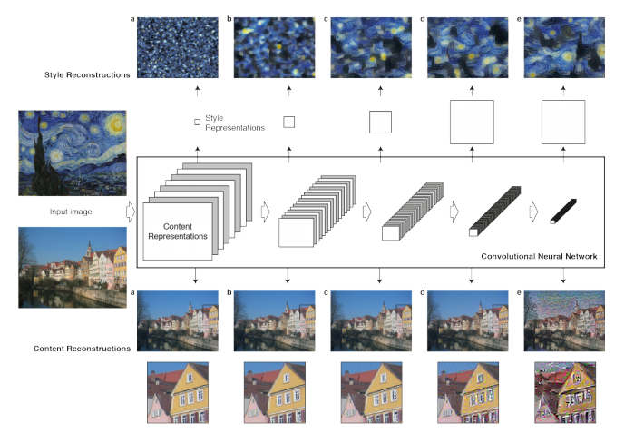 style image를 CNN에 전달하면, 층이 깊어질 수록 layer는 pixel value보다 high-level 정보를 포함합니다. 얕은 층의 출력값은 detailed pixel value 정보를 포함하고 있습니다. 아래 그림을 살펴보면, 층이 깊어질수록 style image의 representation을 더 많이 포함하고 있는 것을 확인할 수 있습니다.