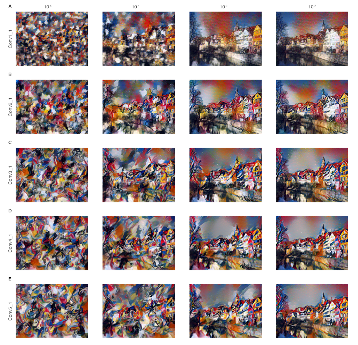 아래 그림은 layer 깊이와 style loss 가중치에 따른 합성된 이미지 결과입니다.