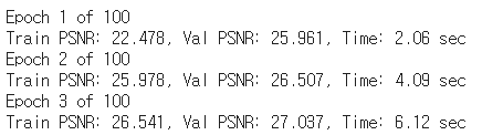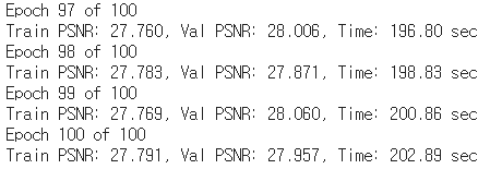 print(f'Train PSNR: {train_epoch_psnr:.3f}, Val PSNR: {val_epoch_psnr:.3f}, Time: {end-start:.2f} sec')