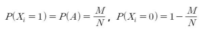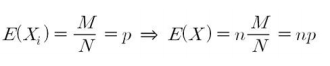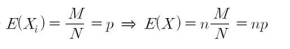 그러므로 $p = M/N$이라고 하면 $E(X_i) = M/N = p$이고 $Var(X_i) = p(1 - p)$가 되고 $X$의 평균은 다음과 같이 계산이 됩니다.