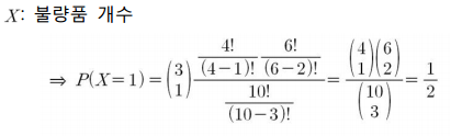 6개가 정상품, 4개의 불량품이 있는 상자에서 임의로 3개의 제품을 비복원 추출한 경우에 3개 중 1개가 불량품일 확률을 구해봅시다.