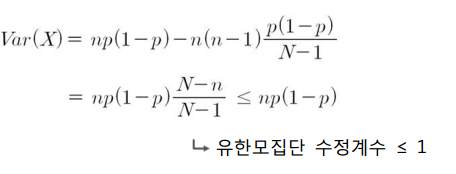 초기하분포의 분산은 이항분포의 분산에 $\frac{M-n}{M-1}$을 곱한 형태인데 이 항을 유한모집단수정항이라고 합니다. 이 값은 n이 1보다 크므로 언제나 1보다 작습니다.