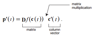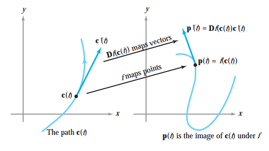 즉, 함수 f의 도함수 행렬은 경로 c의 접벡터를 대응되는 경로 p의 접벡터로 보냅니다.