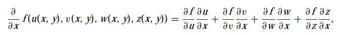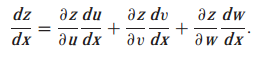 만약 f가 3개의 변수(u,v,w)에 대한 실함수이고, z=f(u,v,w) 이며, u,v,w는 x에 대한 함수 u=g(x), v=h(x), w=k(x)인 경우에 z=f(u,v,w)에서 g(x), h(x), k(x)를 대입하면 z=f(g(x),h(x),k(x))가 됩니다. 이 함수에 대한 연쇄법칙은 다음과 같습니다.