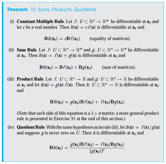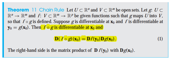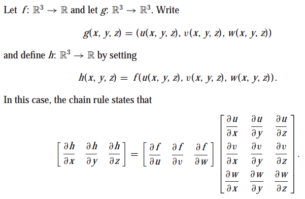 다변수 함수에 대한 연쇄 법칙은 일변수 함수에 비해 복잡해 보입니다. 하지만 미분에 대한 행렬 표기법인 D를 사용하면, 다변수 함수에 대한 연쇄 법칙은 일변수 함수에 대한 연쇄 법칙과 비슷해 보입니다.