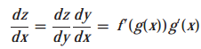 합성 함수(composite function)에 대한 미분 법칙을 연쇄 법칙이라고 부릅니다. 다변수 함수에 대한 규칙은 일변수 함수보다 더 심오한 형태를 취합니다. f가 실함수(real-valued function)이고, z=f(y)이며 y는 x의 함수이고 y=g(x)라고 하겠습니다. 그러면 z는 대입에 의해 x의 합수가 됩니다. 즉, z=f(g(x))이며, 다음과 같은 연쇄 법칙을 갖습니다.