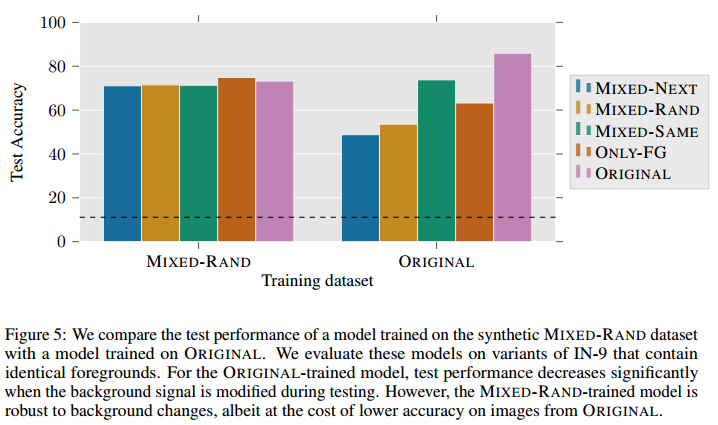 위 그림을 살펴보면 ORIGINAL dataset으로 학습된 경우에 MIXED-NEXT와 MIXED-RAND, ONLY-FG dataset test 정확도가 크게 약화됩니다. 하지만 MIXED-RAND로 학습된 경우에 모든 dataset에 robust 한 경향을 보이네요