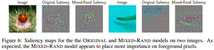 위 그림은 original dataset과 Mixed-Rand dataset 각각 학습된 두 개의 모델의 saliency map입니다. siliency map은 모델이 어디를 보고 분류를 라는지 나타냅니다. Mixed-Rand의 경우에 background signal을 적게 활용하고, foreground에 집중하는 모습을 확인할 수 있습니다.