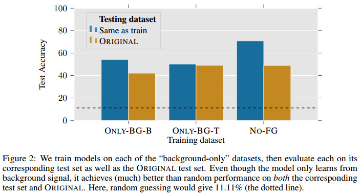 배경만 존재하는 데이터셋으로 모델을 학습합니다. 이 모델을 original ImageNet-9 데이터셋으로 test한 결과, 40~50% 정도의 정확도를 보여줍니다. 이는 모델이 배경으로만 이미지를 분류할 수 있다는 것을 보여줍니다.