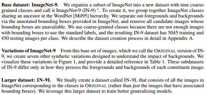해당 논문은 이미지 분류에서 배경의 역할을 평가하기 위해서 새로운 데이터셋을 만듭니다. 우선, ImageNet 데이터셋에서 클레스를 단순하게 통합합니다. WordNet 계층 구조를 사용하여 imageNet class를 조상 class로 변경합니다. 총 9개의 class를 갖는 dataset을 생성합니다. 또한 이미지를 합성합니다.